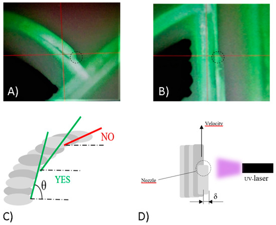 Process camera photo during printing of (A) a chamber wall and (B) a microchannel cantilevered line; representation of the critical angle (C); printing scheme and line offset δ (D).