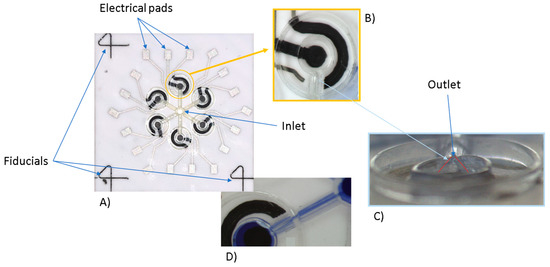 Final platform produced by means of AJP (A), with specific details of the two concentric limiting circles (B) and a frontal view of the triangular channel (C); a channel filled with pen ink (D).