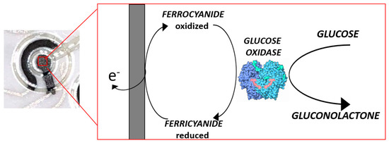 Standard solutions of D-Glucose in Deionized (DI) water have been prepared with the following concentration: 0 mM, 5 mM, 10 mM, 25 mM, 50 mM, 100 mM. For each test, the platforms have been directly used after printing. 20 μL of D-Glucose solution was injected using a micropipette from the central inlet, thus to provide the solution only to the enzyme-coated WEs, to allow the following chemical reactions in presence of GOD (2), producing an amount of electrons proportional to the concentration of glucose, then transported to the electrodes thanks to the mediator (M) (3–4) (Figure 6):