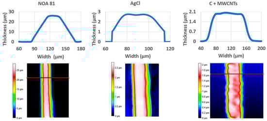 Results from electrical tests show resistivity data in agreement with the nominal values of the manufacturers, considering the specific process parameters for each ink. The use of the thinner to achieve the proper final viscosity has affected AgCl experimental resistivity value (89.5 × 10−8 Ω∙m) that is higher compared with the nominal one reported by Fujikura Kasei. Co. Ltd. (56 × 10−8 Ω∙m). Finally, C experimental resistivity (7.7 × 10−4 Ω∙m) was slightly decreased compared to the one given by Creative Materials (25 × 10−4 Ω∙m), due to the choice performed during the heat treatment in terms of duration and temperature and to multiple material deposition.