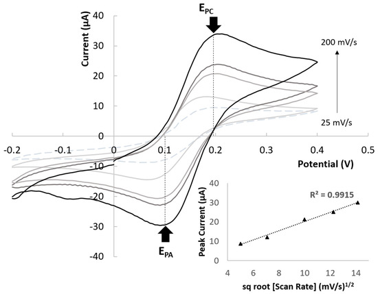 Furthermore, an electrochemical characterization was performed to investigate the effect of scan rate on oxidation and reduction currents and potentials. In detail, multiple CVs in the presence of 5 mM [Fe(CN)6]3−/4− were performed at different scan rates (25, 50, 100, 150, and 200 mV/s) in the potential range −0.2 to 0.4 V using the commercially available portable potentiostat Palmsens3 EIS (Palmsens, Compact Electrochemical Interfaces, Houten, Utrecht, The Netherlands).