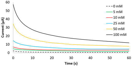Chronoamperograms obtained with different glucose concentrations suggested the possibility to correlate the increase in the steady state current at 60 s with the increase of glucose concentration (Figure 9). The trend of glucose calibration plot appears to be logarithmic over the full range of concentration (0–100 mM). This suggests a higher sensibility of the overall system for lower concentrations and a saturation for higher glucose concentrations.