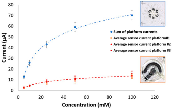 The platform output that estimates glucose concentration of a 20 μL sample is the current sum. Figure 10 shows the average of the three platform output values obtained as sum of the six currents of each platform for each concentration, blank corrected. The sum values are compared to the values of the average currents inside each platform for each concentration. The outputs of the proposed platform permit correct discrimination between every level of concentration, and at the lowest values. The LOD, calculated using the 3-sigma rule, taking as reference the blank standard deviation, is 2.4 mM. This value appears to be suitable for monitoring glucose concentrations typical of human blood, usually included in the range between 3 mM and 10 mM [52]. Furthermore, due to the versatility of the AJP procedure, and the possibility of easily improving the number of layers, these results could be optimized by varying the amount of mediator and enzyme on WEs.
