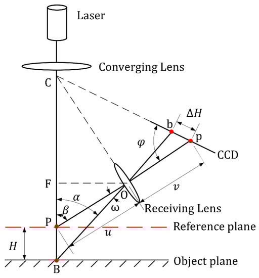 The optical triangulation principle can be divided into two categories: the direct type and the oblique type. Compared with the oblique type, the direct type has output wavelength stability, high light intensity concentration, and a small laser spot diameter. Hence, the direct triangulation principle is more suitable for the depth measurement of objects with good light diffusion properties. As Figure 1 shows, the focused laser beam emitted from the laser is projected onto the object’s surface. Part of the scattering light is projected onto the charged-coupled device (CCD) detector to form a laser light imaging spot caused by the diffuse reflection. According to the geometrical relations and imaging laws, the theoretical measuring displacement H is determined by calculating the transverse offset’s ( image center points on the CCD. Their relationship can be expressed as: