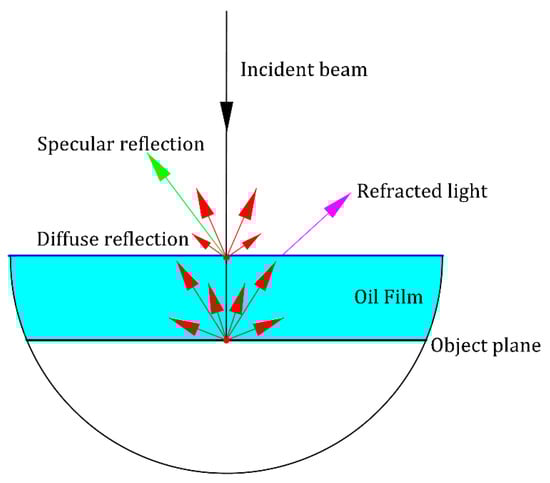 Based on the laser triangulation principle, the precise geometrical relations of the light sources and a good diffuse reflection property of the measuring surface are the precondition of achieving high-precision optical measurement. As illustrated in Figure 2, when the incident laser beam travels through a medium with a different refractive index, such as an oil film, the refraction occurring at the interface between the oil film and air can lead to the change of the intensity distribution of laser reflected from the measured surface, and further result in the decrease of the ratio of the intensity of diffuse reflection light [18]. The ratio can be mathematically expressed as: