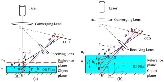 In the first case (Figure 3a), the incident laser beam is focalized through the converging lens and is perpendicularly incident to point B on the object plane, P is the theoretical reference point about the measuring system. As a result of the differences in the refractive index, the imaging spot on the CCD for point deviates from the theoretical position b to the practical imaging position . From another perspective, can be considered the imaging spot of , where is the intersection point of the laser optical axis with the reverse extension of its refraction ray , N is the intersection point of the scattered light of BN with the upper surface of the oil film. Finally, in accordance with the light refraction principle, the following equation is possible: