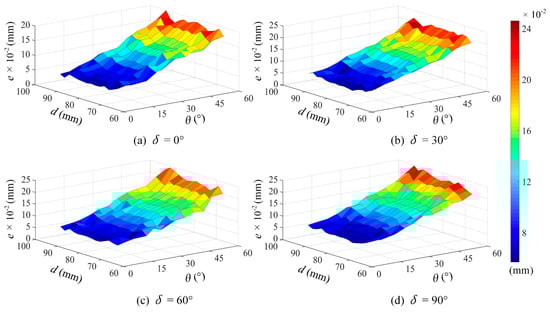 After a series of tests, we obtained the error maps related to the various parameters (d, θ, and δ); Figure 6 shows the evaluation results. It can be seen that under the same measuring conditions, the errors increase strongly with the increase in azimuth angle δ; and when δ is certain, the errors increase with either the increase in scan depth d or the incident angle θ. However, within the entire measurement range of the laser probe, when θ and δ are fixed, the changing regularity of the error maps as related to the scan depth d is complicated. Conversely, when d is in the range of 75 mm to 85 mm, which means that the measuring object is located near the center of probe’s measuring range, the errors is relatively small with more stable variations. This analysis reveals that in this case, the errors caused by the scan depth d is relatively small and its influence on measuring accuracy can be approximately ignored.