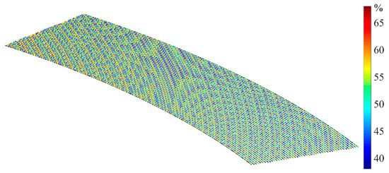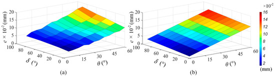On the basis of the model in Equation (15), after obtaining the probe’s parameters (θ, δ) at each measuring point, the corresponding error at each point was obtained. We then compared the measurement results after compensation and the benchmark data of the actual CAD model. The quantitative improvement () by percentage can be mathematically expressed as: