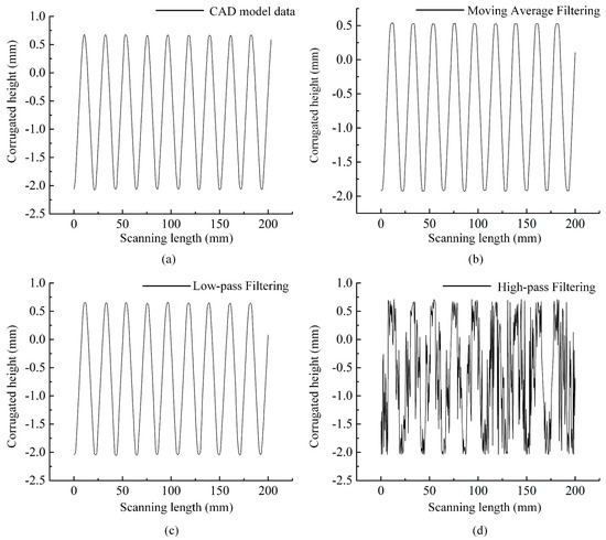 Real- or frequency-space filtering processing have been widely used as a pre-processor for automated data analysis tools [27], because the raw data usually include invalid data caused by the hardware system and/or the measurement environment. The filtering to the raw data can be completed via the open source software or commercial software. In our test, the LK-Navigator 2 software provides several filtering methods such as the moving average filtering, low-pass filtering, and high-pass filtering, each of methods has their own filtering parameters. In this section, based on the multi-section measurement of a chevron-corrugated plate, we used several comparison experiments to investigate whether the application of a digital filter influences the accuracy of free-form surfaces measurement. The parts of one cross-section of the laser data and its corresponding computer automated design (CAD) model data are displayed in Figure 8a–d.