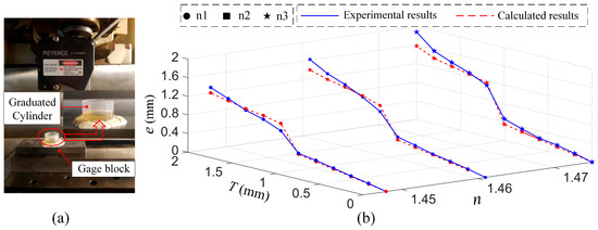 Figure 9b compares the calculated and experimental errors of different variables with thickness T and refractive index . The three blue solid lines represent the experimental results for oily substances n1, n2, and n3, and their corresponding red dotted lines are the calculated results from the model in Equation (13). The maximum error caused by the oil film is much greater than the system calibration accuracy (52 μm), which indicates that the presence of an oil film is one of the most important sources of error affecting the measurement accuracy of the laser triangulation probe.