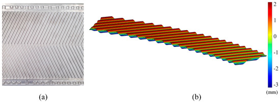 To simulate the procedure of free-form surface measurement and validate the effectiveness of the empirical error model in Equation (15), a chevron-corrugated plate was used for the analysis, as illustrated in Figure 10a. The original data (about 24,000 points, Figure 10b) were acquired via the laser triangulation measuring system using the translation and rotation method; the low-pass filtering method was selected and set to = 300 Hz. The measured part was treated to ensure the surface had a homogeneous metallic luster before being placed at the center of probe’s measuring range. Then a few application prerequisites for the empirical compensation model listed in Section 4.2. were satisfied.