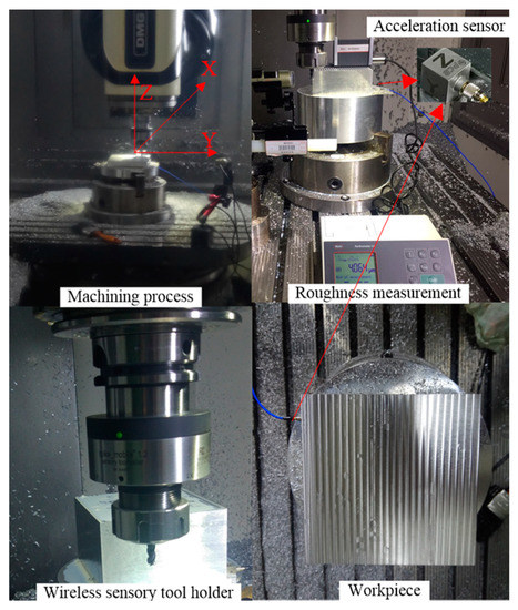 In this section, the proposed method for surface quality monitoring with a wireless sensory tool holder is evaluated experimentally. The real milling experiment was designed to collect the supporting data to train the surface quality monitoring model. The proposed approach runs on a server with a 2.40 GHz processor and 64 GB RAM. The machine tool is a five-axis DMG MORI with Numeric Control Siemens 840D sl. The machining material used for the experiments is aluminum alloy 7109. The cutting tool is a cemented carbide three-flute end milling cutter, and the diameter is 6 mm. A wireless sensory tool holder (Type: HSK63) manufactured by Pro-Micron GmbH & Co. KG was installed in the machine tool to replace the universal tool holder. The data collected from the tool holder were transmitted to the PC software through a receiver unit with one antenna wirelessly. The sampling rate of wireless sensor is 2500 Hz/channel. In order to illustrate the effectiveness of the proposed method based on the wireless sensory tool holder signals, vibration signals in three directions (X, Y and Z) during the milling experiment process were also collected by a wired triaxial acceleration sensor (Type: PCB 356A32) mounted on the machining material. NI-9234 was used for data acquisition. The sampling rate of the acceleration sensor is 51,200 Hz/channel. The experiment environment, the wireless sensor layout and the acceleration sensor layout are shown in Figure 2.
