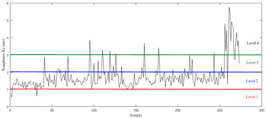 The machining operation was carried out with spindle speed of 6000 rpm, feed rate of 2000 mm/min, and a depth of cut of 1 mm in the z direction. A new cutting tool was used to cut the workpiece. With the exacerbation of tool wear, the surface quality became worse. In this experiment, the surface roughness average parameter Ra is adopted as the indicator of surface quality of the workpiece, which was measured by a surfagauge (Type: Mahr M1-set) after completing each surface cutting. The surface quality is divided into four levels according to Ra. The evaluation length was 17.50 mm and the basic length was 2.50 mm. The Ra was measured four times and the mean value was considered. The machining needs to be stopped for cooling after each cut because of the dry milling process. The analysis results are presented and discussed below.
