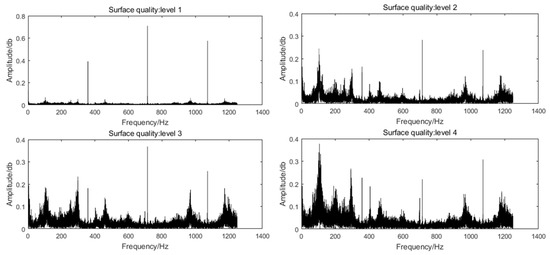 All bending moment signals are analyzed by FFT to obtain the sensitive frequencies of the cutting situation so that the sensitive frequencies can be selected for wavelet packet decomposition. The bending moment signals of different surface roughness levels are taken for FFT analysis, as shown in Figure 6. The results show that the frequencies related to the cutting situation are mainly concentrated around 100~150 Hz, 350~400 Hz, 700~750 Hz and 1050~1100 Hz. The sampling frequency is 2500 Hz, and so the second degree wavelet is utilized to reveal the details of the specialized frequency band.