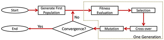 Based on the simplicity of the implementation, for the large problem size, and its popularity in similar applications [23,24], the genetic algorithm (GA) was chosen as the optimization algorithm. The flowchart for the implementation of GA is shown in Figure 3.