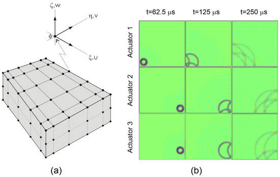 (a) Modeling approach showing 3D spectral element with three nodes across the thickness; (b) Wave propagation patterns at selected times propagating from Actuator Nos. 1, 2, and 3, respectively.
