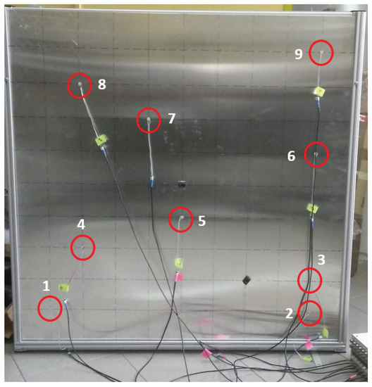 The measurements were carried out using the PZT sensors and actuators in the pitch catch mode. In order to apply and register electric voltage to and from the transducers, an integrated generation/acquisition system was used. It had 13 channels, 12 of which can serve for acquisition and one for generation at any moment. The system was connected to a personal computer with a USB cable and controlled by an application implemented in the MATLAB® environment. The MATLAB environment allows us to choose the number of channels to be used, the number of cycles in the excitation (sine), the frequency of excitation, the modulation type (Hanning, triangle, or rectangular window), and which channel is a wave generator. 200 kHz was chosen as the frequency of excitation, and the sampling frequency was 1.25 MHz. The PZT sensors used for the actuation and sensing were manufactured by Ceramtec out of Sonox P502 material. These transducers were monolithic piezoelectric discs with a diameter of 10 mm and a thickness of 0.5 mm.