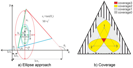 (a) Nomenclature for the ellipse approach for a triangular plate; (b) Explanation of coverage terminology.