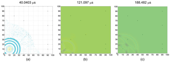 As can be seen, the wave propagation front is circular due to the isotropic material. Furthermore, it was seen that for out-of plane measurements, A0 mode was dominant, and as a result, the signal processing for damage identification was easier and hence was chosen for the time of flight calculations. It is noted that the time for the simulation using a CPU: Intel I5 4460 3.2 GHz, 16 GB RAM, was 215 h, while the same using a GPU: Nvidia Tesla K20X 6 GB RAM, was 36 h. Hence, although the GPU reduced the computation time, the time requirement was very large, and hence, analytical implementation of the optimization problem was necessary.