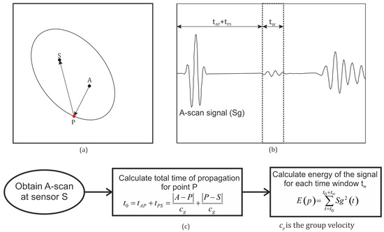 Scheme for obtaining ellipses from the A-scans. (a) Plate with the actuator (A), sensor (S), and point (P) on the plate; (b) A-scan at sensor S; (c) Flowchart for obtaining the ellipse.
