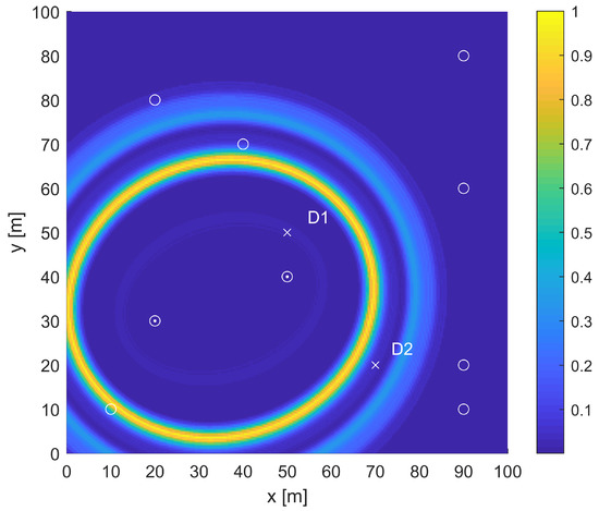 A similar transformation scheme was followed for the A-scans obtained from the LDV measurements, and the ellipses corresponding to different time instance are shown in Figure 12. As can be seen, the innermost ellipse was based on the reflection from the mass placed at the “x” mark. The red ellipse is based on the reflection from the left boundary of the plate. The light blue ellipse passes through the second “x” mark where another mass was placed. In the signal processing algorithm used for the purpose of the study, if the time signals after the first reflection from the boundary were discarded, the reflection from the second mass would be discarded, and as a result, the sensor pair 4–5 will not cover the location of the second mass. On the other hand, the first mass will be detected by the sensors at Locations 4 and 5. This shows that the largest ellipse approach is valid based on numerical and experimental results and may be used for the OSP.