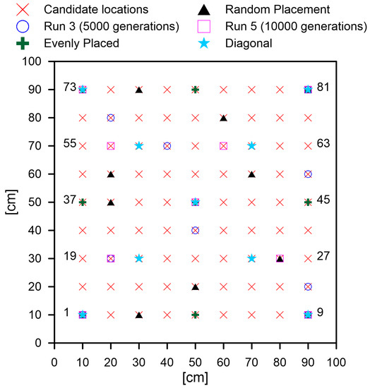 For the coding of the GA, each gene of the chromosome corresponds to the sensor position. The sensor positions assigned for different integers are shown in Figure 13. The GA iteratively generates sensor placement configurations and assesses their suitability based on the cost function chosen. The sensor configurations are then sorted based on their suitability. Fifty percent of the sensor networks (chromosomes) are retained (elitism), while the others are discarded. The discarded networks are replaced by the new generation, which is formed by mating of the retained chromosomes. Some degree of mutation (1%) in the retained population is induced for conducting a thorough search in the close vicinity of the retained population. The number of generations refers to the number of iterations of the selection, mating, and mutation (shown in Figure 3) that are allowed for the search of the optimal solution. The GA is a meta-heuristic optimization algorithm and for large problem size does not guarantee complete convergence. Hence, several runs of the GA were made, which yielded different sensor placements. However, each of the sensor placement yielded better results than the random placement, as shown in Table 1. It should be noted that the GA was run for minimizing the cost function identified in Equation (1). However, only the and objectives were represented, as the cost function lacks physical significance due to the scalarization.
