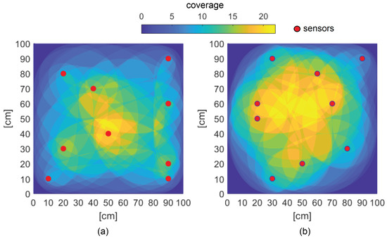 The parameters of the GA were chosen as the number of generations = 5000 and the number of chromosomes = 64. The mutation rate = 1%, and elitism = 50%. The cost function was chosen similar to the previous simulation for the square plate. The coverage for the optimized placement is shown in Figure 15b. The optimization algorithm indeed yielded the optimal result and served as a validation of the algorithm. Again, the optimized sensor placement was symmetric, but this was only true for the isotropic plate; hence, there is merit in optimization for complex plates, which is identified as work for the future.