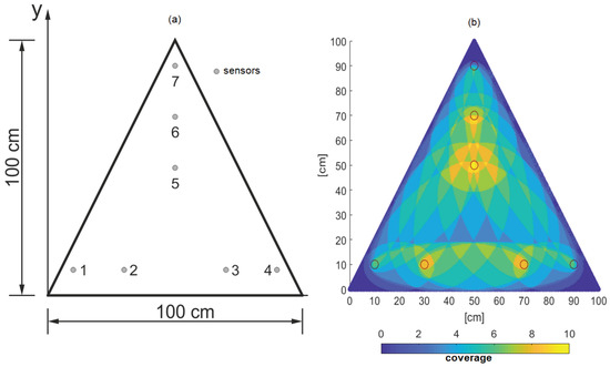 (a) Geometry and arrangement of piezoelectric transducers in the triangular aluminum plate; (b) Surface plot showing coverage for the triangular plate.