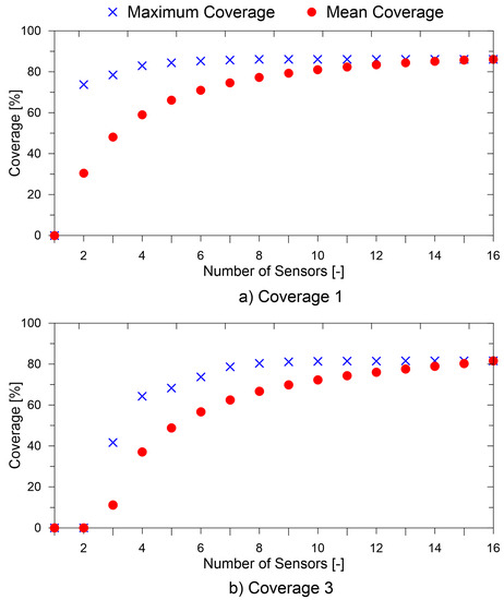 In order to study the effect of different objectives and their weighting factors, sensitivity studies were run on a problem of reduced size. The candidate locations for the sensor were reduced to 16 (instead of 81). For the reduced problem size, all possible sensor placements were analyzed. Figure 16 shows the maximum coverage and the mean coverage achieved by the network for the chosen number of sensors.