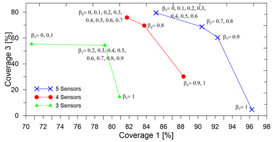 As can be seen, for an increasing number of sensors, the and values increased. Furthermore, it can be seen that for different values of , different sensor placements were obtained, allowing different and values. The decision on the value of may be determined based on the threshold value of the coverage values required for the application at hand. For instance, for critical applications, it might be necessary to detect damage while the isolation of damage may be carried out through other NDEand NDTtechniques, in this case, a lower value of may be necessary. Furthermore, in some other non-critical applications, the isolation of damage may be just as important as the detection. The Pareto front allows us to make an informed decision based on the options at hand.