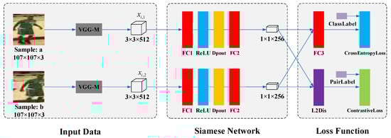 To exploit the representation capabilities of CNNs, Tao et al. [9] proposed a matching function with the Siamese network to extract feature vectors, which was named the Siamese Instance Search for Tracking (SINT). This new method was trained using the contrastive loss. Similarly, in [7], a fully convolutional Siamese-like tracking algorithm (SiamFC) was proposed, which was supervised by the logistic loss.