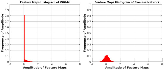 To illustrate the effect of the proposed Siamese network, we collect the feature maps from conv3 in VGG-M and our proposed Siamese network. These feature maps are obtained by the first frame of 100 video sequences in OTB-2015 [29]. The histograms of the collected feature maps are depicted in Figure 2. The width of the bins is set to be . As shown in Figure 2, we can see that the amplitude frequency in the range of is . Moreover, in the range of , amplitude values are equal to 0. Therefore, the feature maps of conv3 in VGG-M are sparse and there exists redundant information, which are not relative to visual tracking task. With our proposed Siamese network, the histogram of the obtained feature maps is depicted in Figure 2. The frequency of the amplitude value range is now . Moreover, points with zero amplitude are removed. In other words, our proposed Siamese network effectively eliminates redundant information.