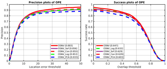 The attributes of fast motion, background clutter, motion blur, deformation, in-plane rotation, and illumination are mainly relative to the feature model’s representation ability. As Figure 6 depicted, our proposed algorithm outperforms SiamFC_3s and SINT_noflow on all attributes. For the illumination and scale variation, compared to MCPF, the OSNV makes gains about and , respectively.