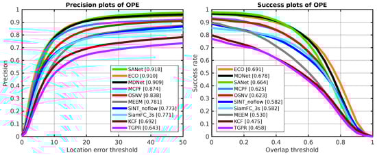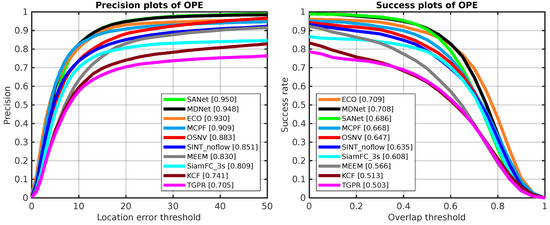 The dataset of TempleColor has 129 video sequences. With the source codes of ECO, MDNet, SANet, MCPF, SiamFC_3s, SINT_noflow, KCF, MEEM, and TGPR downloading from authors’ project pages, we use the OTB [29] evaluation tool to generate the OPE comparison results in TempleColor. For the tracker TGPR, it has a bug to test the video sequence Pool_ce3 in TempleColor. As for the MDNet and SANet, they also have bugs in video sequence Pool_ce1 and Table_tennis_ce, respectively. Thus, we exclude all of them for comparison. In addition, the training dataset of SINT is not independent from TempleColor. Thus, we also exclude it. The performance results are depicted in Figure 9. Our proposed algorithm makes a gain about compared with the SiamFC_3s.