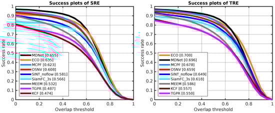 The robustness evaluation results of nine tracking algorithms on OTB-2013. The left side is the success plots of spatial robustness evaluation (SRE). In addition, the right side is the success plots of temporal robustness evaluation (TRE).