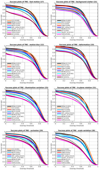 In [14], Wu et al. proposed to categorize the sequences by annotating them with 11 attributes. In this paper, we show comparison results on eight attributes: fast motion, background clutter, motion blur, deformation, illumination variation, in-plane rotation, occlusion, and scale variation. The success plots of TRE with nine tracking algorithms on different attributes are depicted in Figure 6. The evaluation metric is the success rate with overlap threshold on TRE. The number in every sub figure’s title indicates the amount of video sequences belongs to that attribute. The performance of algorithms corresponding to those eight different attributes represents the ability of the tracking method to deal with different challenges.