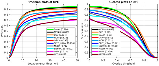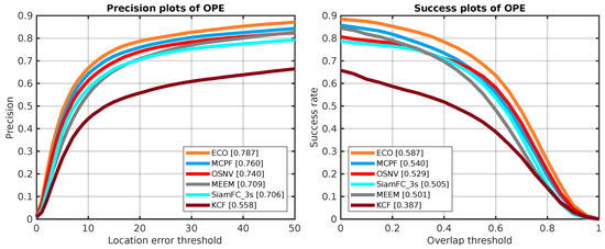 Here, we compare the proposed algorithm OSNV with nine state-of-the-art tracking algorithms on the challenge tracking benchmark OTB-2015 [29], which has 100 test video sequences, and the size of it is twice as big as OTB-2013. As shown in Figure 7, the proposed algorithm OSNV achieves a comparable result against MCPF on success plots. For the algorithm SiamFC_3s and SINT_noflow, the OSNV has demonstrated superior performance in two metrics.