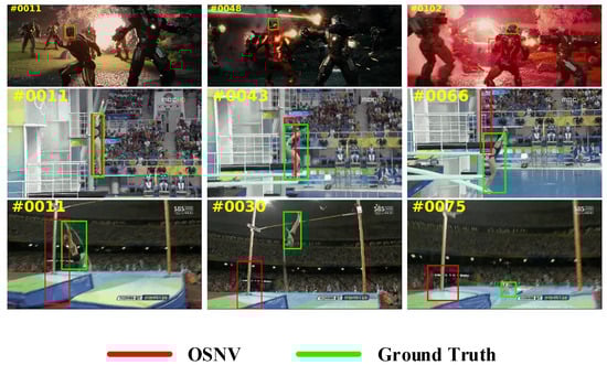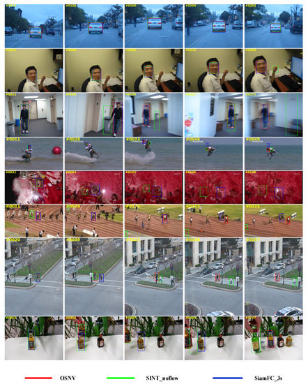 We select two representative tracking algorithms to compare with the OSNV to perform qualitative results on eight challenging sequences. For each video sequence, we select five images to be shown. The performance results are shown in Figure 10.