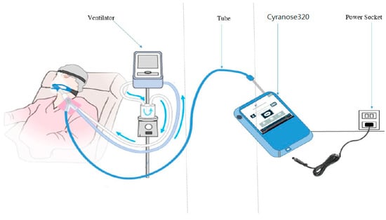 Exhaled breath is rich in many VOCs. A recent review reported 1765 volatile compounds appearing in exhaled breath. Exhaled breath contains metabolites in the gas phase called VOCs. Therefore, exhaled breath analysis can be used to identify the causative pathogen in patients suspected of VAP [34]. Schnabel et al. reported that a subset of 12 VOCs could be used to discriminate patients with VAP [35]. Cyranose-320 electronic nose (Sensigent intelligent sensing solutions) was used for patients’ breath gases data collection, which is equipped with 32 individual polymer sensors. The breath gases were collected at the end of the ventilator paths, as shown in Figure 1. The database, included a total of 24 subjects, of which, 12 subjects were the patients that admitted to the Taipei Medical University Hospital (TMUH) with pneumonia, and the others were non-infected individuals. ICU patients were mainly patients who had received neurosurgery without infection evidence and lung disease. The raw data of 140 samples were collected for each patient, totaling 3360 raw data points collected. In order to avoid bacterial variation due to the implementation of treatment, non-injected antibiotic patients’ breath gases were collected as an experimental database. To ensure patients’ safety, the sampling processes were carried out by expert medical staff, and the sampling time was limited to 10 s. The details of data collection distribution of the selected boundaries between the VAP infected and non-infected patients are shown in Table 2. The present research received the approval from the Institutional Review Board at TMUH of Taiwan. Written informed consents were obtained from the 24 patients.