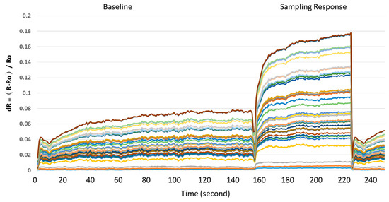 Figure 2 shows the collected data of a typical response of the Cyranose320 device and sensor module of 32 sensors array [41]. The first stage (around 0–150 s) was the baseline value of the room air. Then, in the second stage (around 151–230 s), when 32 sensors were exposed to breath samples, the resistance changes across the array were captured as a digital pattern that is representative of the test results. Finally, MATLAB software was used to extract features from the data saved in the Cyranose320 device using the static change in sensor resistance. In order to standardize the measurement, all data were normalized via a fractional difference model as in Equation (1), where R is the response resistance of the sensor to the Pseudomonas aeruginosa samples, and Ro is the baseline value of the room air using as a reference gas. Furthermore, the data set of the 32 sensors was normalized to [0~1] by dividing each dR by the maximum value for each sensor as shown in Y axis in Figure 2.