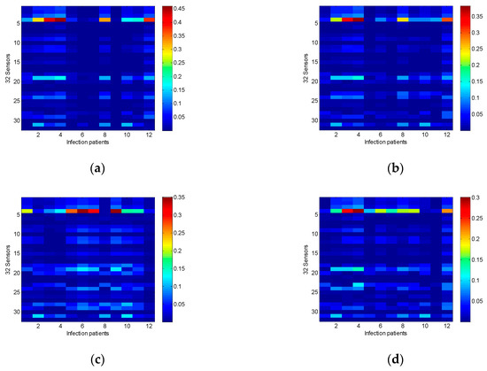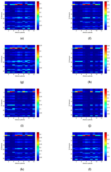 The MATLAB command ’imagesc’ was utilized to scale image data to the full range of the current colormap and displays the image. The results are shown in form of images for comparative analysis, which are very intuitive and easy to read as shown in Figure 3. According to the colormap, the blue color presents very low and the opposite red color presents very high values. Therefore, the cost function is based on the mean absolute error (MAE) of the sensor resistance of 12 infected patients with pneumonia and non-infected patient (i.e., from (a) to (l) of Figure 3 of all 12 patients) in all 32 sensors. Results show that the differences of resistances response between pneumonia patients and non-infected patients are very small for sensors numbers 6, 10, 13, 21, 27, and 32. Therefore, this experiment excludes these six sensors since there is no significant effect on the analysis results. Removing these six sensors data from the data set can reduce the algorithm’s complexity and increase its performance. Finally, the gases data collected from the remaining 26 sensors were used to establish the pneumonia identification models.