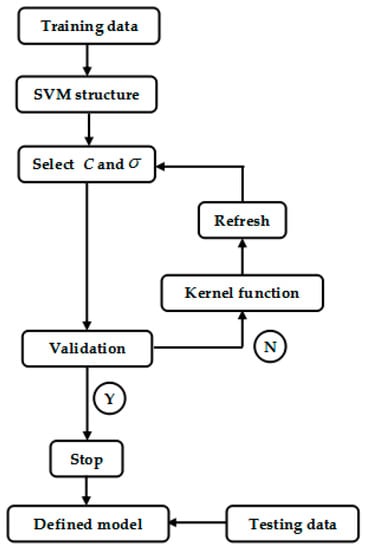 RBF is the most used transfer function for SVM model. SVM contains two kinds of crucial parameters known as the kernel function parameters and regularization parameters that are very important for the performance of SVM model [45]. Reasonable parameter values can make the SVM model achieve higher training accuracy and stronger generalization ability. is too small or too large, the generalization ability of the SVM model may get worse. If is too small, the training accuracy may be high, but the testing accuracy will be pretty poor, which is a phenomenon known as over-fitting. However, when using too large , the SVM model cannot get particularly high accuracy either. Above all, for the SVM model to have the highest classification performance, the most suitable and parameters must be selected first.