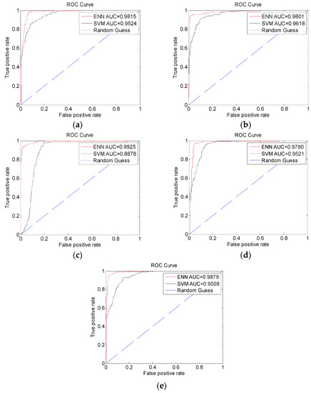 The ROC curves of ENN models: (a) dataset1, (b) dataset2, (c) dataset3, (d) dataset4, and (e) dataset5.