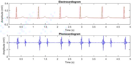 Plot of simultaneously recorded ECG and PCG signals, showing the temporal relationships among heart sounds and ECG waves.