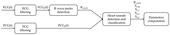 The temporal locations of the R-peaks extracted from the ECG signal are used as a reference for the segmentation of the PCG signal as well as to identify the timing of the two main heart sounds and of their components. The processing is implemented in the Matlab® environment. Figure 3 presents a block diagram of the overall algorithm.