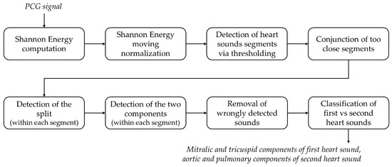 Finally, all negative values are set to zero, thus obtaining a nonnegative envelope signal, characterized by the same length and resolution (1 ms) as the recorded PCG. The preservation of the initial time resolution is necessary to obtain a precise identification of the heart sounds main components. The detection of the two main heart sounds along with their components is performed on the Shannon energy signal based on amplitude and time thresholds. In particular, Shannon energy null values correspond to noise and should be discarded by means of an amplitude threshold [21,28]. Besides heart sounds, also murmurs and artifacts may cause positive peaks in the Shannon energy signal, but they can be deleted in a second phase thanks to the usage of time thresholds. Figure 5 shows the details of the detection algorithm.