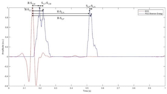 Representation of a filtered ECG signal and of the Shannon energy of the corresponding PCG signal within a single cardiac cycle.