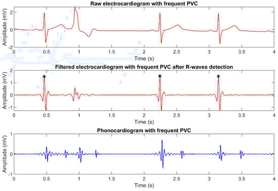 Figure 8 presents an example of how PVCs affect the corresponding ECG and PCG recordings. As it can be seen in the plots, PVCs are strongly attenuated by digital filtering and are not detected by Pan-Tompkins algorithm, thus resulting in the discarding of the corresponding heart sounds, as expected.