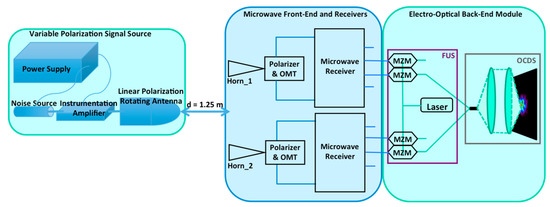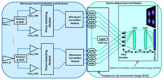 The use of electro-optical correlators is an alternative solution already implemented in embedded instruments designed for security and defense [11], and also proposed for astronomy as a Michelson correlator [12]. They allow a drastic reduction in the complexity of correlating the large amount of wideband microwave signals for large-format instruments, in contrast to microwave correlators and, moreover, avoiding expensive telescopes. In this work, this concept is applied to a microwave polarimeter [13] operating in two frequency sub-bands: From 10 to 14 GHz and from 16 to 20 GHz. In particular, a demonstrator is developed to test the operation and viability of the instrumental concept shown in Reference [11], applied to CMB astronomical experiments. Figure 1 shows a simplified block diagram of the polarimeter instrument. The prototype developed in this work is composed of a front-end module (FEM) connected to two microwave receivers, operating in the two sub-bands previously mentioned and an electro-optical back-end module (EOBEM) with a frequency up-conversion stage (FUS) at the input, connected to an optical correlation and detection stage (OCDS). The microwave receivers share the conceptual design of the ones of QUIJOTE experiment [14,15], but some modifications are included to split the 10–20 GHz input signal in two sub-bands of interest (10–14 GHz and 16–20 GHz). On the other hand, the detection stage of QUIJOTE-like receivers is replaced here by the EOBEM with an input microwave to near-infra-red (NIR) FUS, composed of a laser and a set of commercial LiNbO3 Mach–Zehnder modulators (MZM), and an OCDS implemented basically with a fiber array, a pair of lenses, and a camera. All these components are already described in Reference [16]. An advantage of this concept is that the same OCDS can be used to operate both as a synthesized-image interferometer and also as a traditional imager, only by changing the optical configuration of the OCDS. In the first case, the instrument provides a synthesized image of the polar parameters in the sky region determined by the instrument field of view (FoV), which is mainly determined by the beam of the horn antennas. In the second case, the OCDS is basically a NIR detection stage of the up-converted microwave signals that have the polar information of the CMB. In the last case, a telescope is required to focus the signal from the sky to the instrument, but the potential implementation of the EOBEM and part of the receivers in narrow-band PIC (photonic integrated circuits) technology, makes this concept also interesting, expecting reductions in cost, volume, weight, and power consumption with respect to wide-band traditional microwave technology.