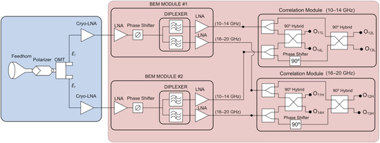 In this section, some details about the microwave receivers are explained. As it was mentioned before, the receivers have the same conceptual design of the ones of QUIJOTE experiment [14,15] but with some improvements and optimization in the design. In particular, the operation bandwidth is the same of the QUIJOTE multi-frequency instrument (MFI) [15], but with a receiver design using an electronic polarization modulation similar to thirty- and forty-gigahertz instruments (TGI and FGI) [19]. On the other hand, while MFI has two polarimeters covering the band from 10 to 14 GHz and the other two covering the band from 16 to 20 GHz, the receivers of the proposed demonstrator split the full 10–20 GHz input signal to obtain the Stokes parameters of the two sub-bands in each polarimeter. Therefore, it would be possible to optimize the filling of the telescope focal plane, improving the sensitivity of the resulting instrument. Figure 2 shows a detailed diagram of the front-end and microwave receiver implemented for this work. Front-end and first back-end elements are designed to cover the overall 10–20 GHz bandwidth. Then, the diplexer splits the original bandwidth in the two sub-bands of interest (10–14 GHz and 16–20 GHz) to feed two correlation modules, which combine the signals in such a way that, at the output, the microwave signals are proportional to a combination of the corresponding Stokes parameters in each frequency band.